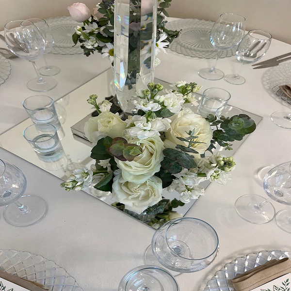 Vazo/Ayak: Orta süsleme, uzun, şeffaf, cam veya kristal görünümlü bir kaide veya vazo üzerine yerleştirilmiş, bu da masada oturanların birbirini rahatça görmesine olanak tanıyor.