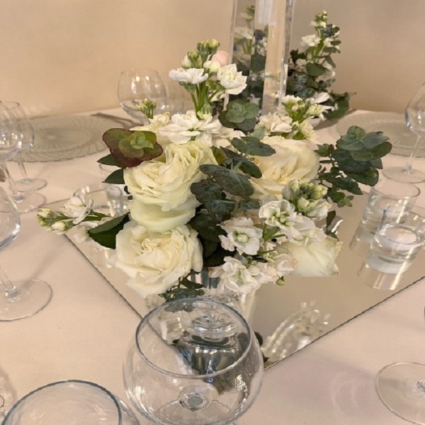Çiçekler: Şamdanın iki yanında, alçak ve küçük aranjmanlar yer alıyor.
