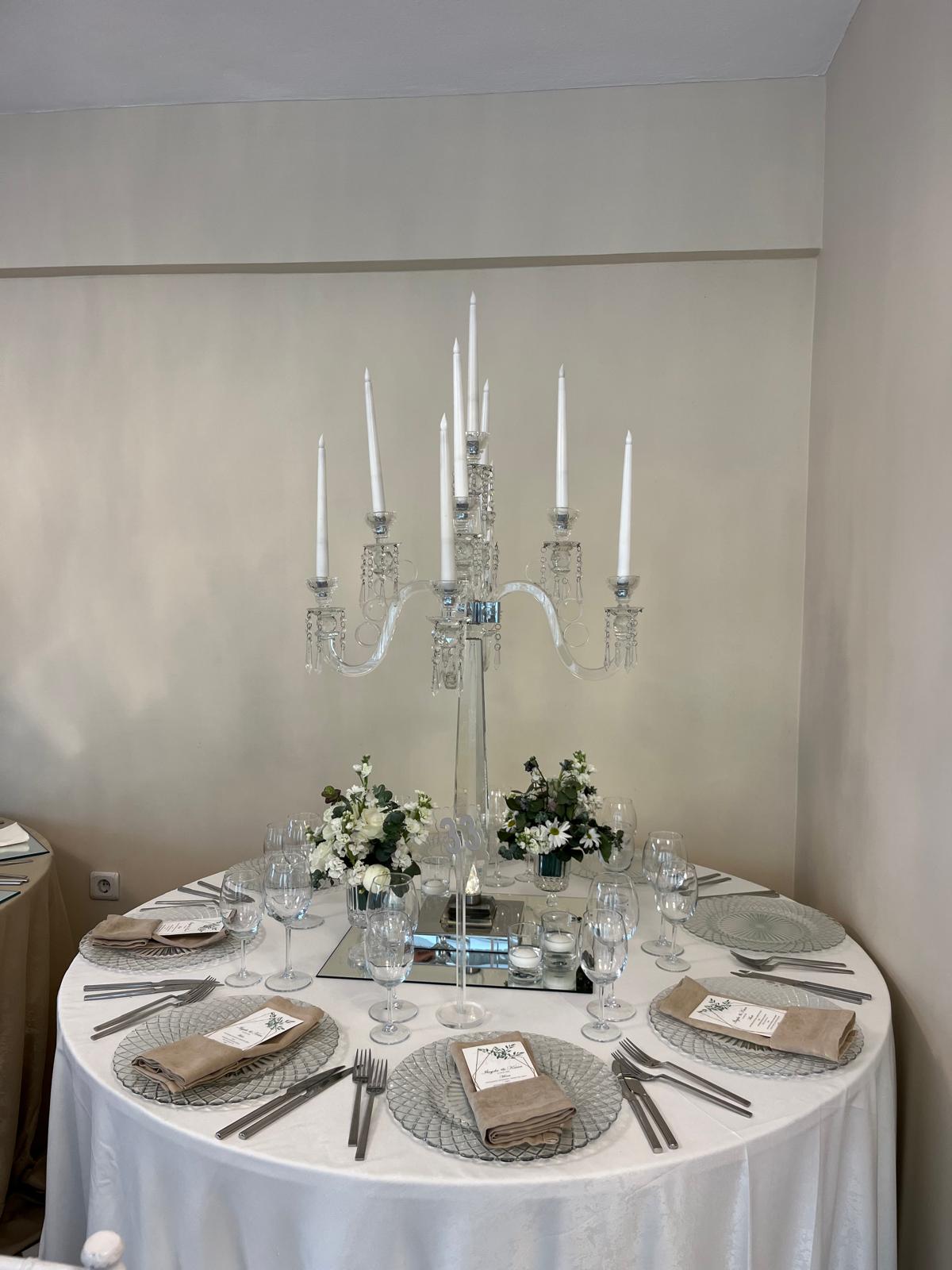 Kristal Şamdan: Masanın merkezinde, dikey hacmi sağlayan en dikkat çekici unsur, uzun ve çok kollu kristal bir şamdandır. Şamdanın üzerinde ince, uzun, beyaz çubuk mumlar (mumlar henüz yakılmamış) bulunuyor. Kristal detaylar, ışığı yansıtarak masaya lüks ve ışıltı katmaktadır.