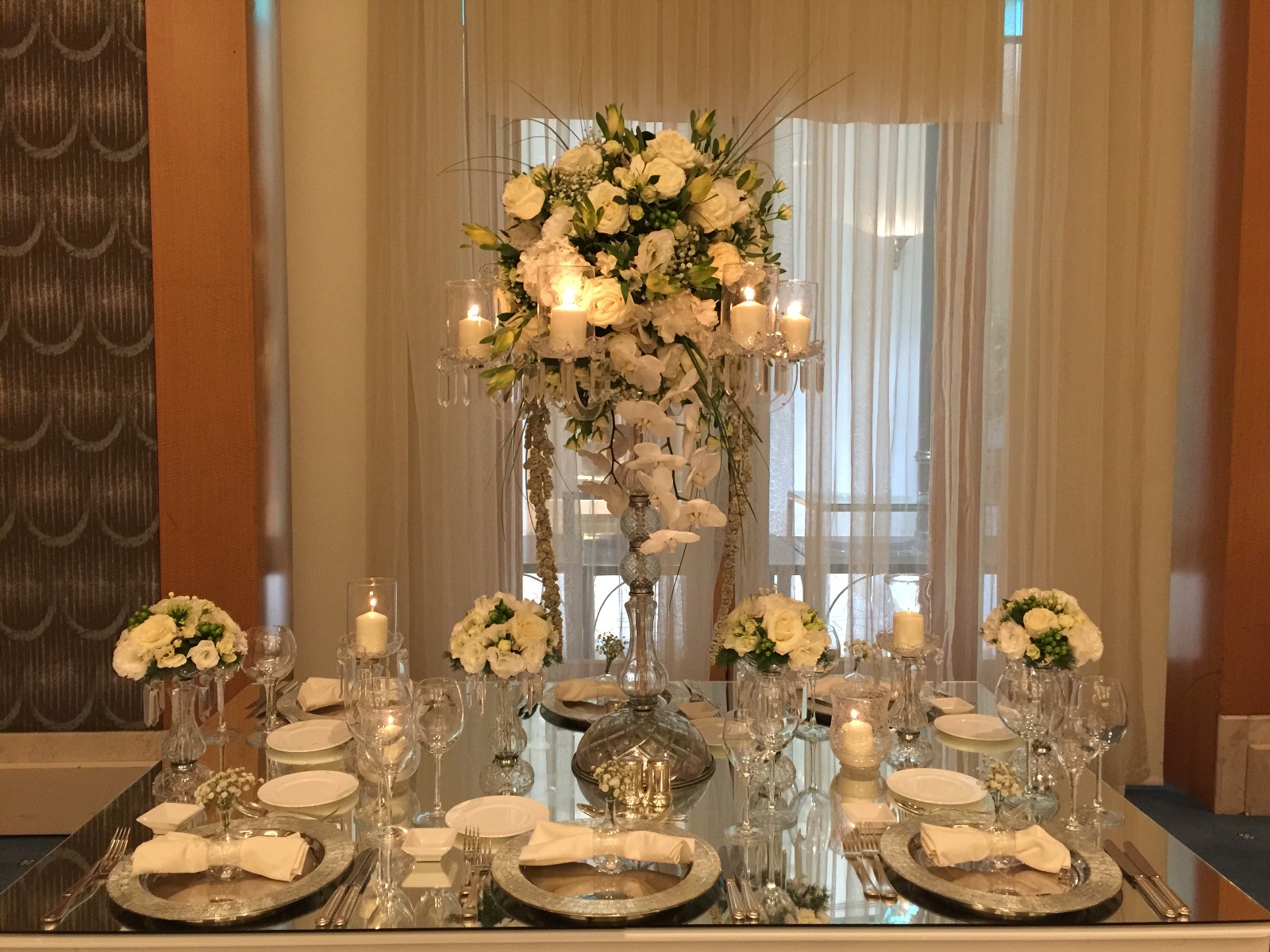 Masanın merkezinde oldukça yüksek, gösterişli ve dramatik bir orta süsleme (centerpiece) yer alıyor.