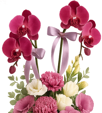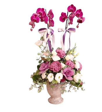 • Aranjman, iki dal mor Phalaenopsis orkidenin dikey eksende konumlandırılmasıyla oluşturulmuştur.