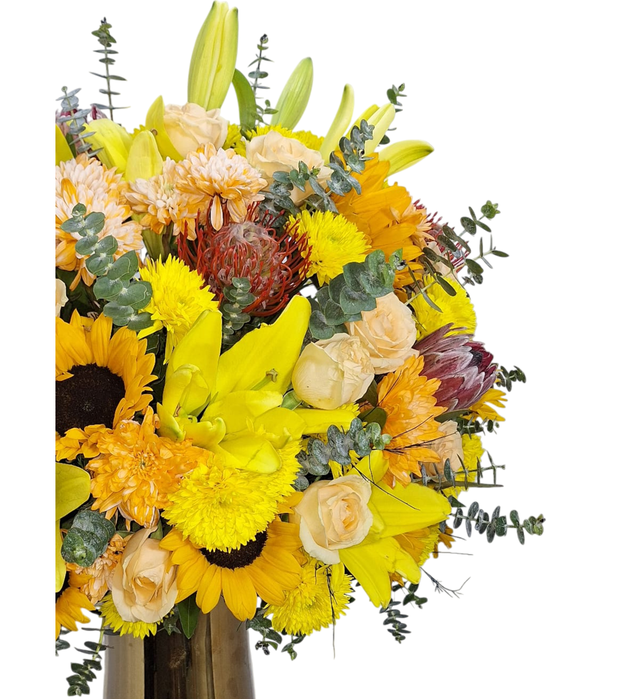 Sarı Zambak (Yellow Lilyum): Büyük, parlak sarı zambaklar (lilyum), aranjmana dikey çizgi ve zarafet katar.
