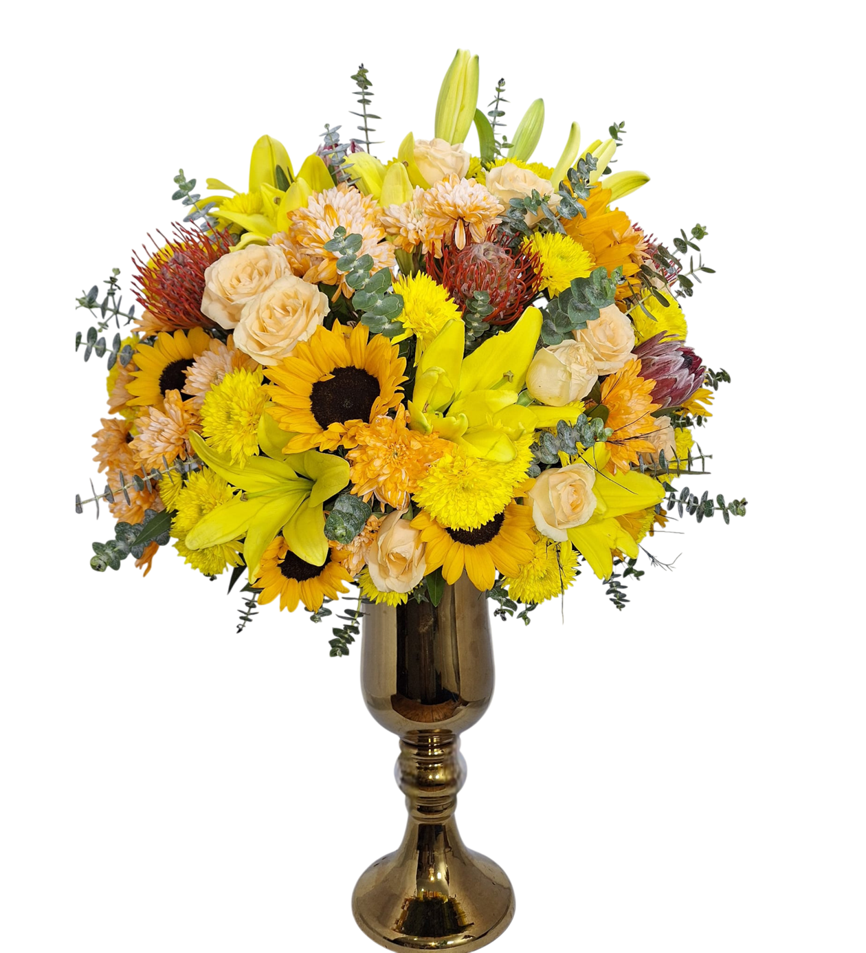 Vazo: Aranjman, parlak, yüksek ve kadeh formunda altın (gold) rengi bir vazo içinde sunulmuştur. Bu vazo seçimi, tasarıma lüks ve resmi bir görünüm kazandırır.