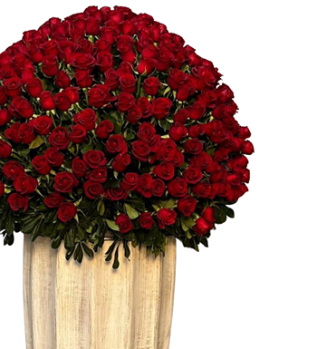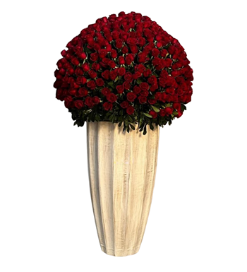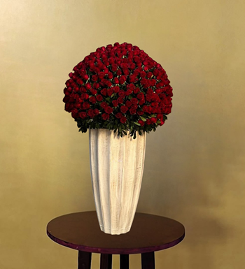 Kırmızı güllerin yoğunluğu ve küre formu, görsel olarak güçlü bir etki yaratır.