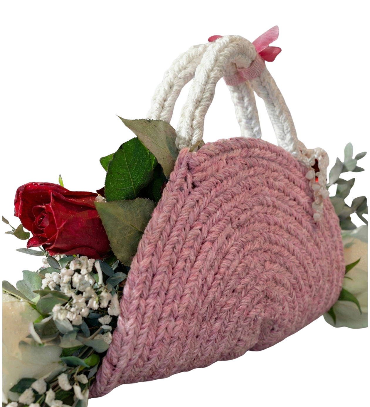 Sadece bir çiçek buketi değil, kalıcı bir hatıra hediye etmek ister misiniz? Yumuşacık dokusuyla el yapımı pembe örgü çanta, en taze kırmızı ve beyaz güllerin zarafetiyle buluştu.