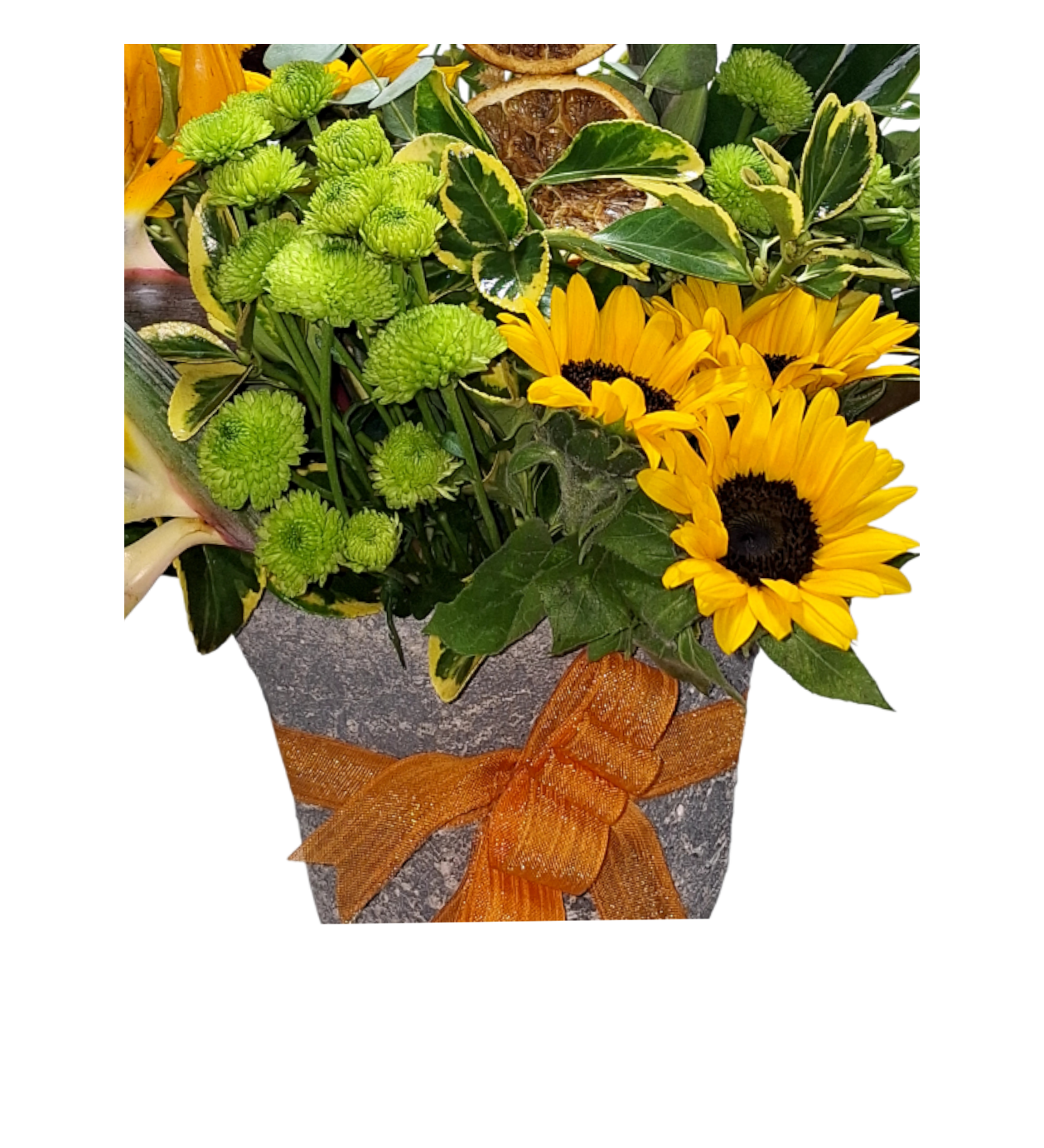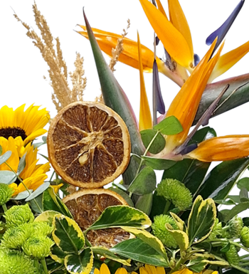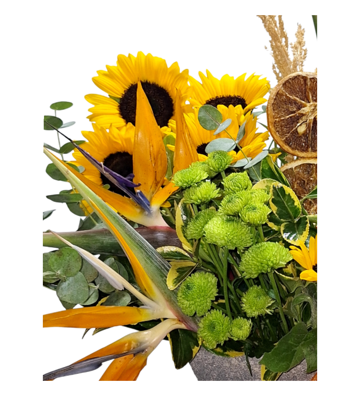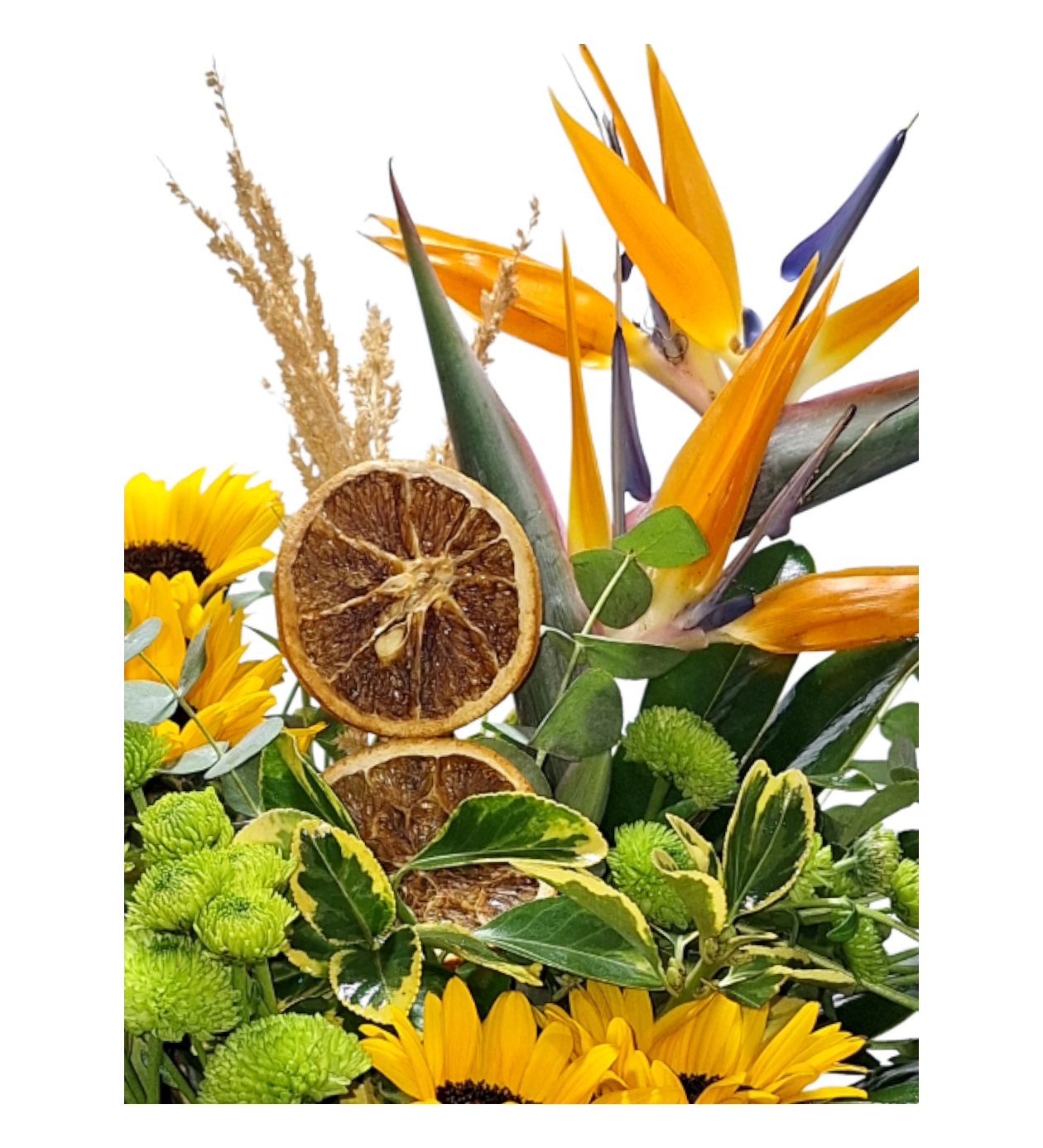 Bu çiçek aranjmanında günebakan (ayçiçeği), cennet kuşu çiçeği (Strelitzia), yeşil krizantem, okaliptüs yaprakları ve kurutulmuş portakal dilimleri bir araya getirildi