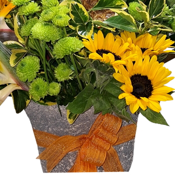 Bu özel tasarım, enerjik tonlarıyla doğanın canlılığını ve yaz ışıltısını yansıtır. Gri taş görünümlü vazo, turuncu fiyonk detayıyla sade ama zarif bir denge oluşturur. Cennet kuşu çiçeklerinin tropikal asaleti, ayçiçeklerinin neşesiyle birleşerek hem modern hem doğal bir görünüm yaratır.
