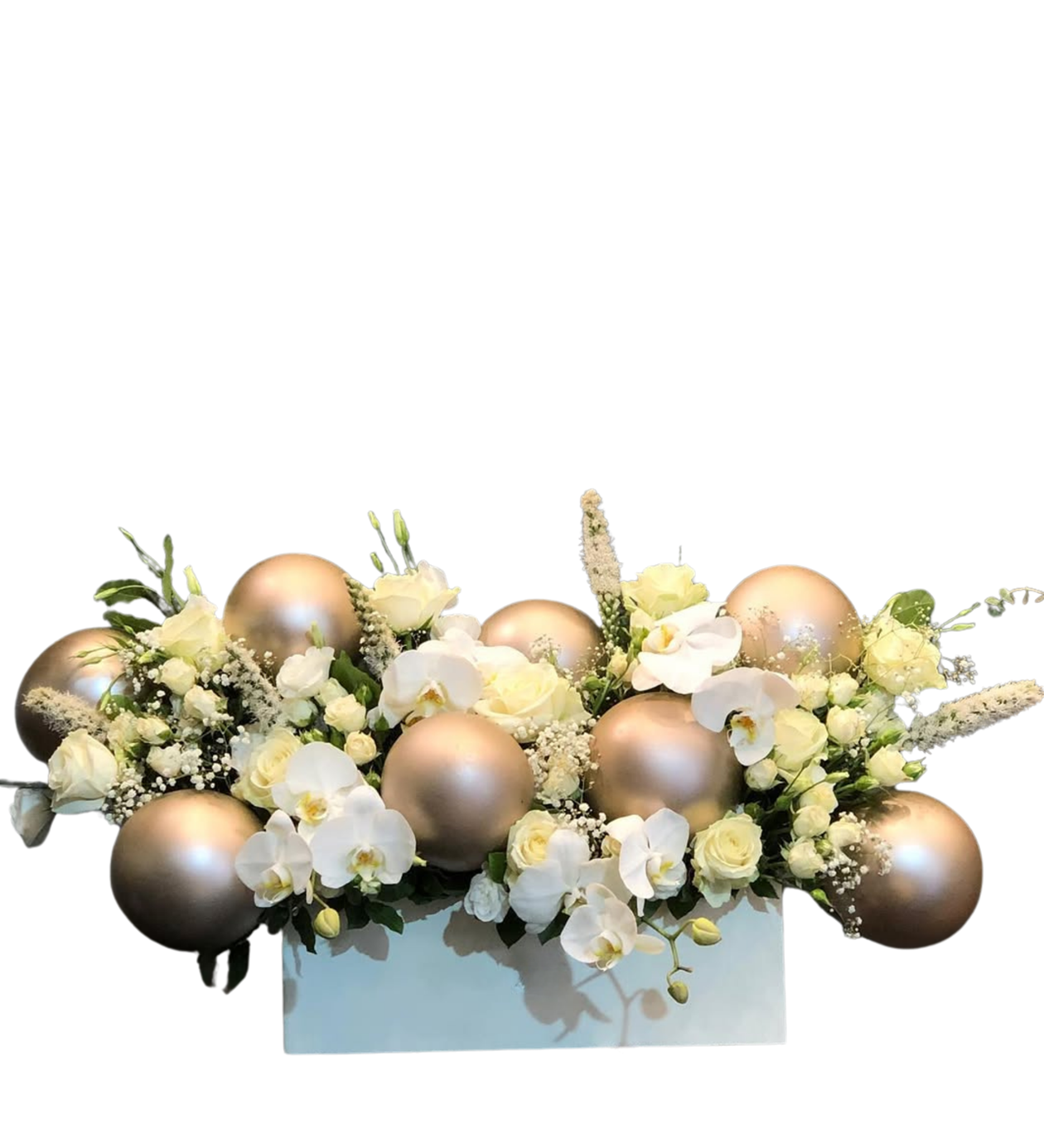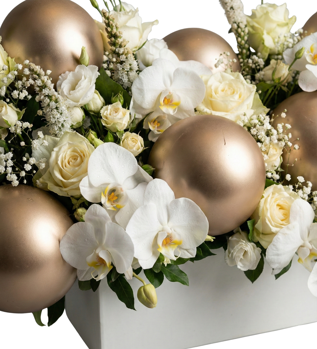 Modern Tasarım Detayları: Çiçeklerin arasına yerleştirilen dekoratif gold küreler, aranjmana üç boyutlu bir derinlik ve kutlama havası katar.