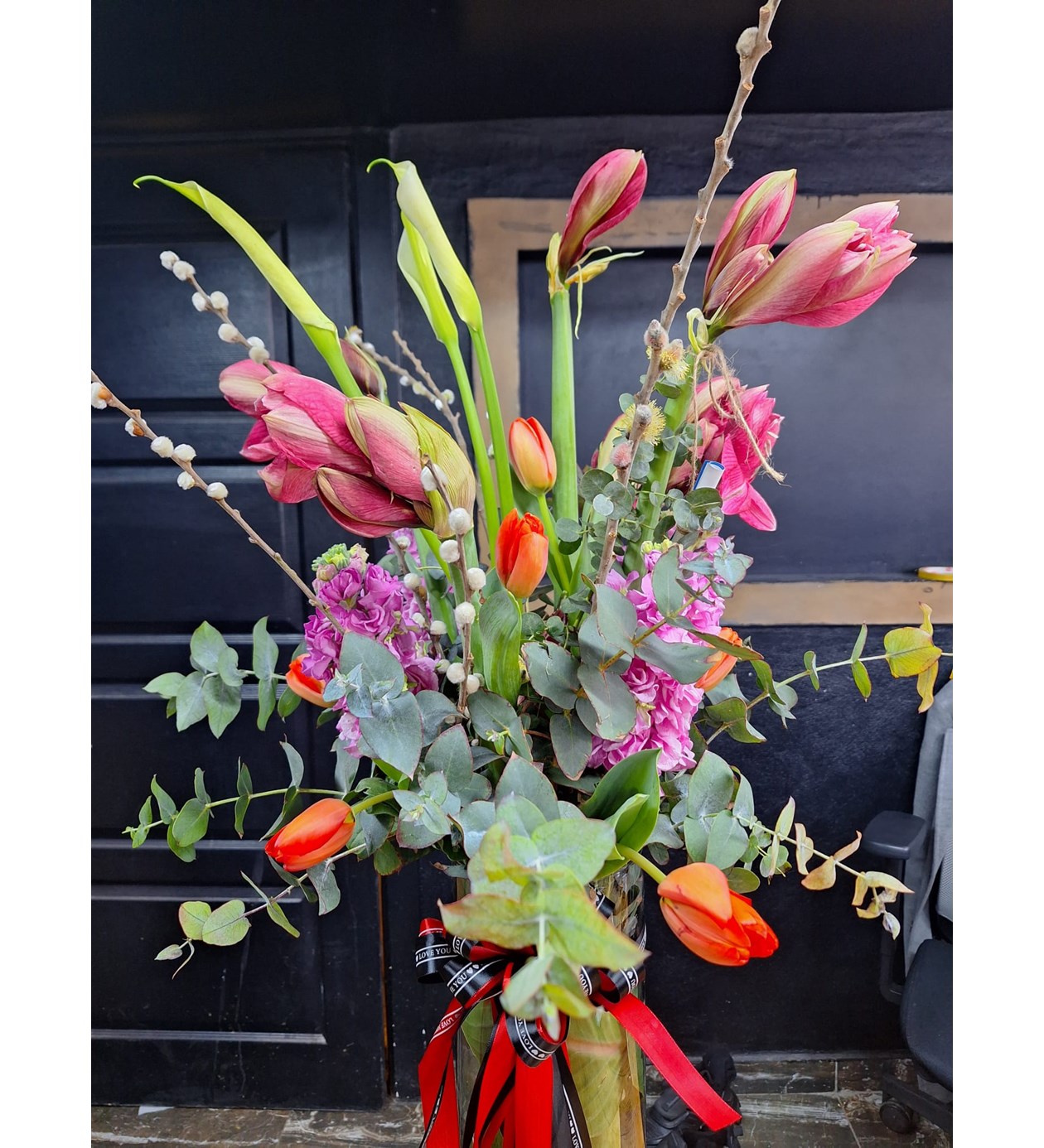 Çiçekler koyu renkli bir kapı önünde, iç mekân ortamında duruyor.