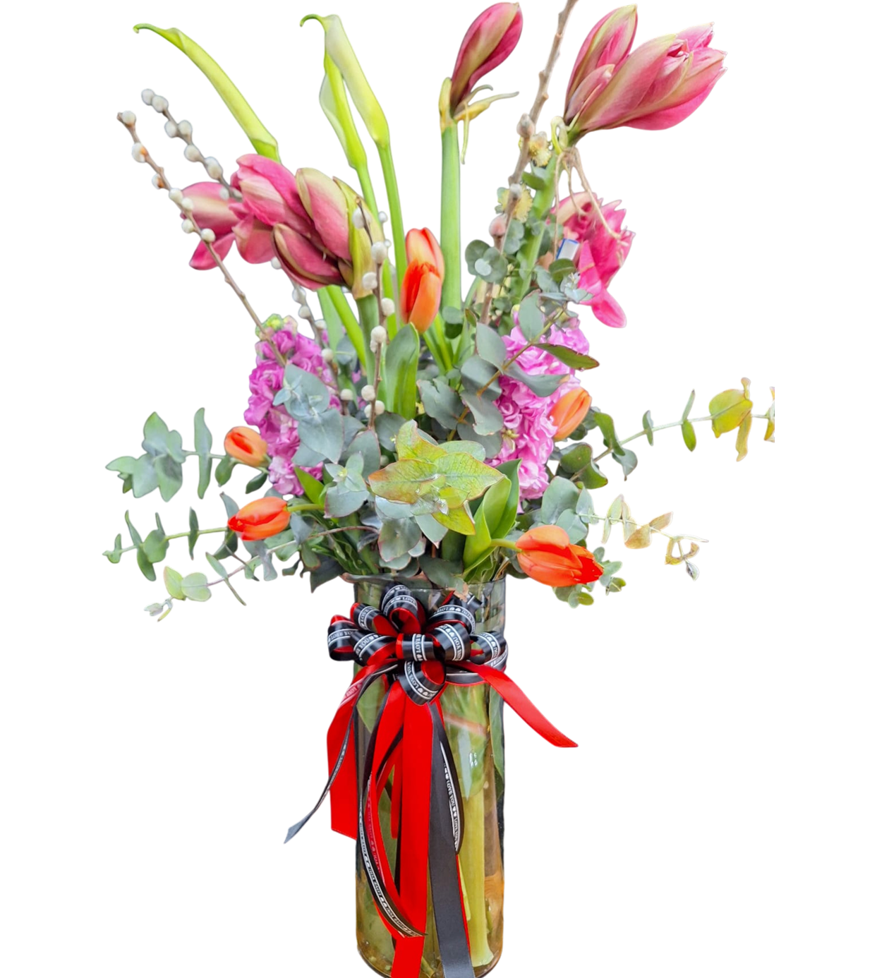 Kontrast renkler (kırmızı, pembe, turuncu, yeşil) aranjmanı dinamik gösteriyor.