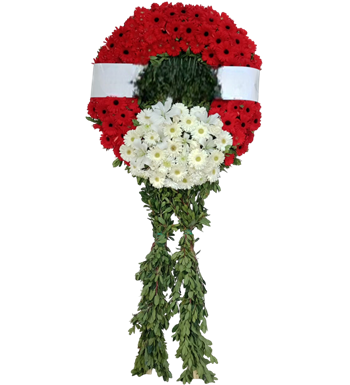 Çelenk, sadece iki ana renkte yoğun olarak kullanılmış çiçeklerle sade ve resmi bir görünüm sunar: