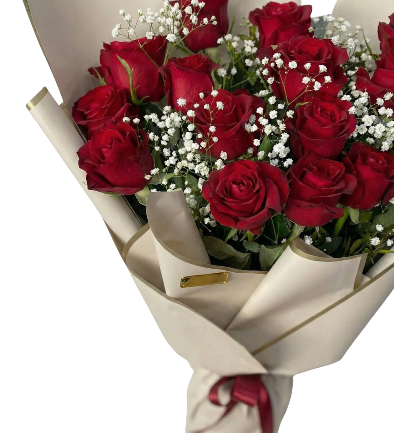 Ambalaj: Güllerin rengini ortaya çıkaran, krem/bej tonlarında altın şerit detaylı modern ithal kağıt ambalaj.