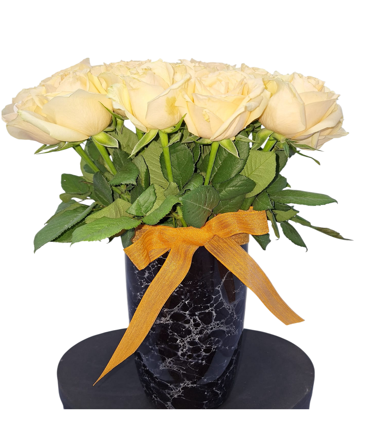 Siyah mermer desenli vazo ile güllerin şık kontrastını öne çıkarır. |
