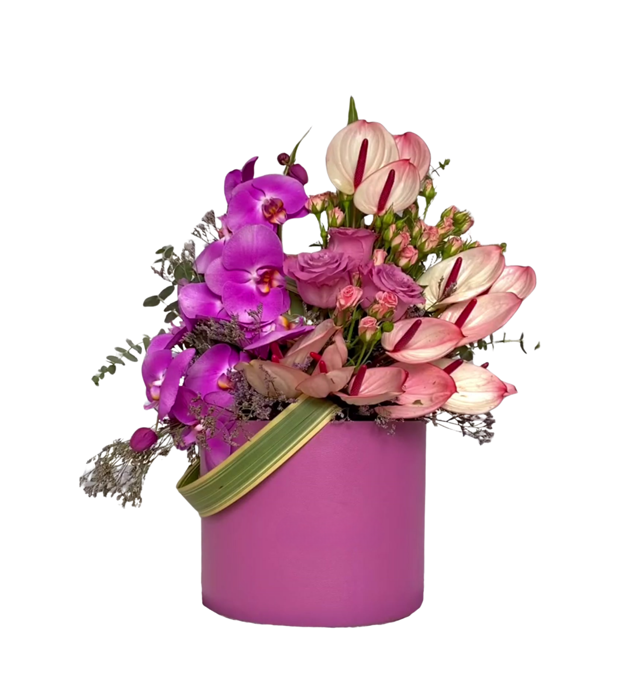 Özel Çiçek Seçkisi: Egzotik mor Phalaenopsis orkideler, dokulu pastel antoryumlar ve kadifemsi ithal güllerin zengin birleşimi.