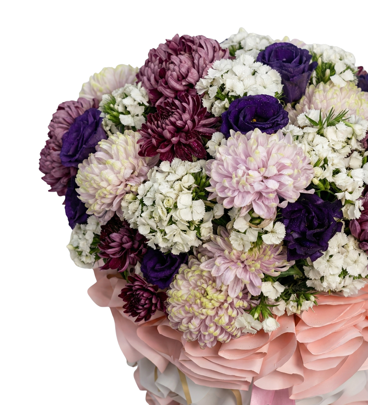 Ana Çiçekler: Mor Lisianthus (Eustoma), Lila/Pembe Krizantem, Beyaz Hüsnüyusuf veya benzeri dolgular.