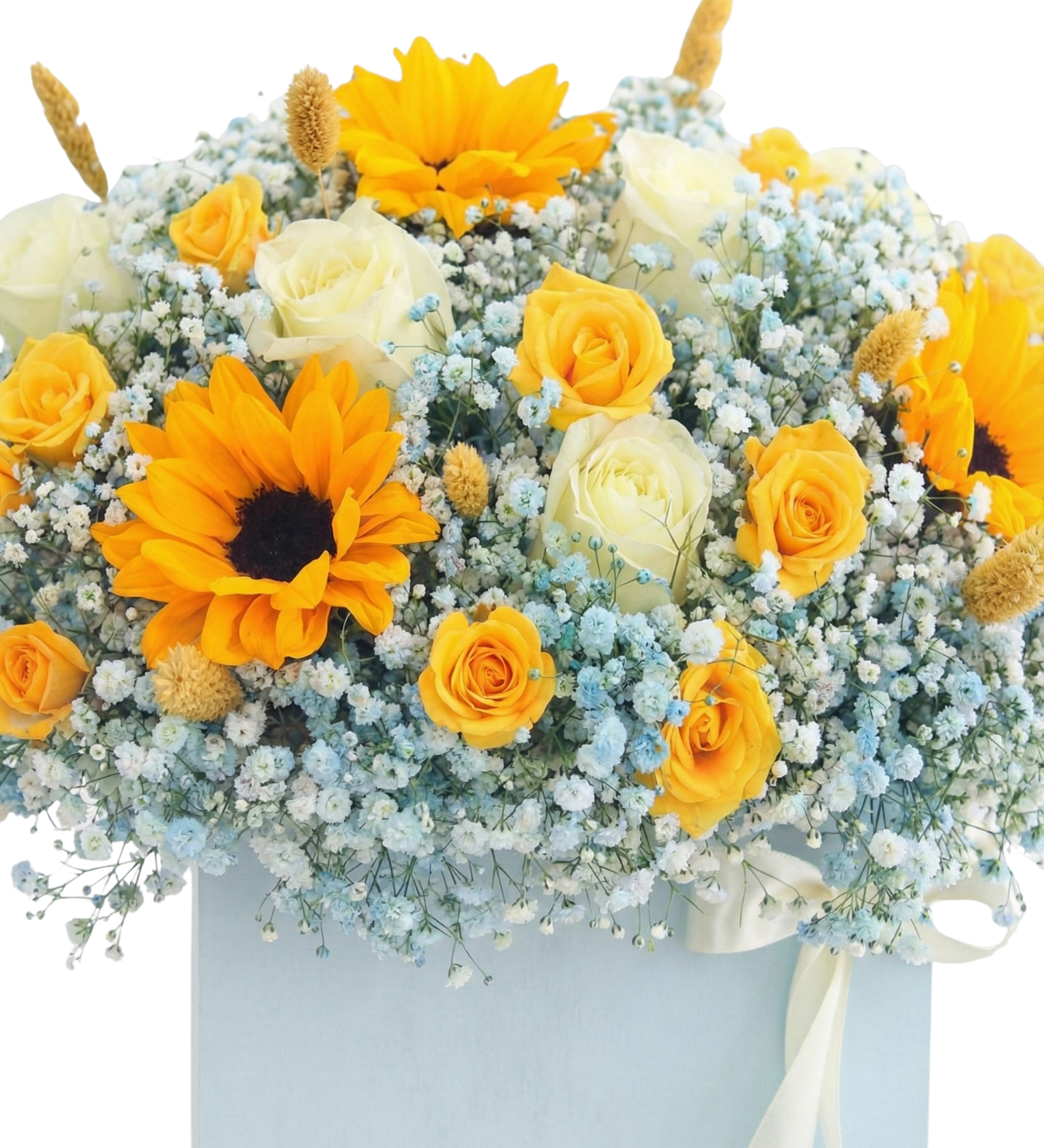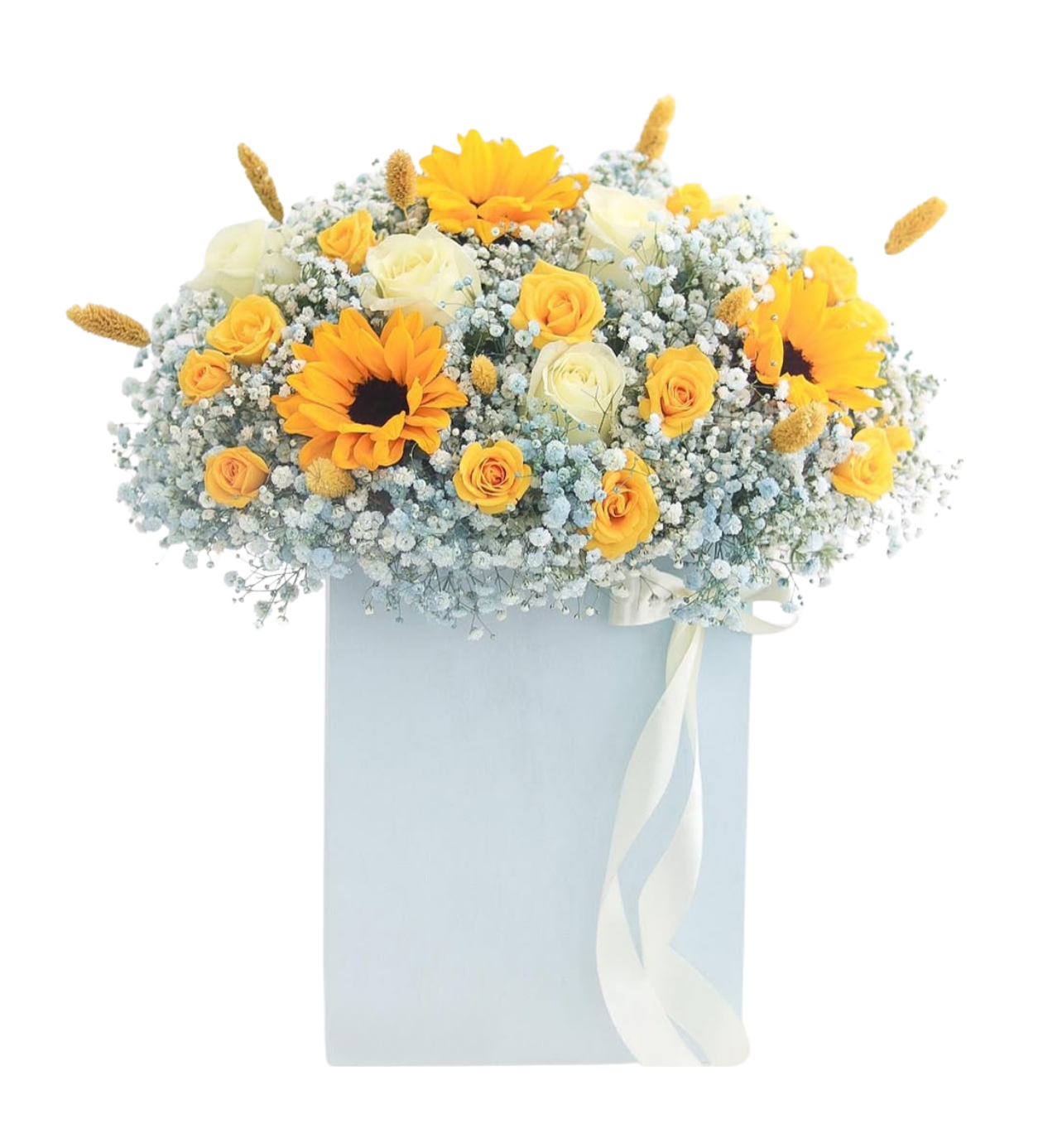 Tamamlayıcılar: Bol miktarda Cipsofilya (Gelin çiçeği) ve dekoratif kuru başaklar (Lagurus).