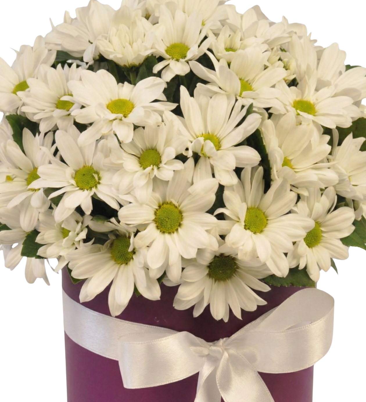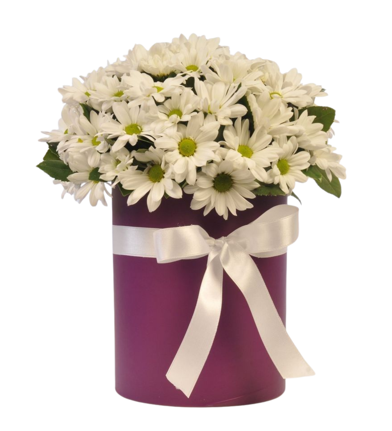 Mor Silindir Kutu: Çiçeklerin beyazlığını kontrast oluşturarak ön plana çıkaran, kaliteli karton silindir kutu.