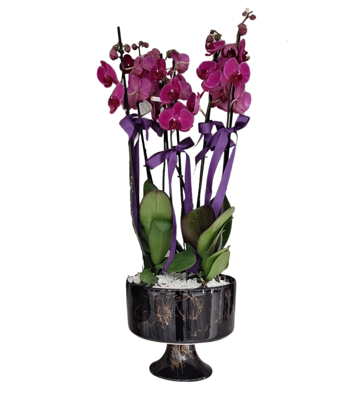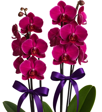 Çiçek İçeriği Dört adet koyu mor renkte, canlı ve dolgun Phalaenopsis orkide.
