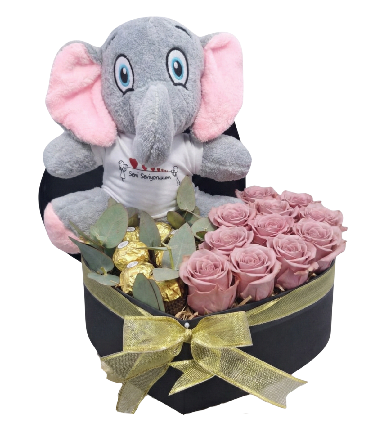 Peluş Figür: 1 adet "Seni Seviyorum" yazılı tişört giyen sevimli peluş fil