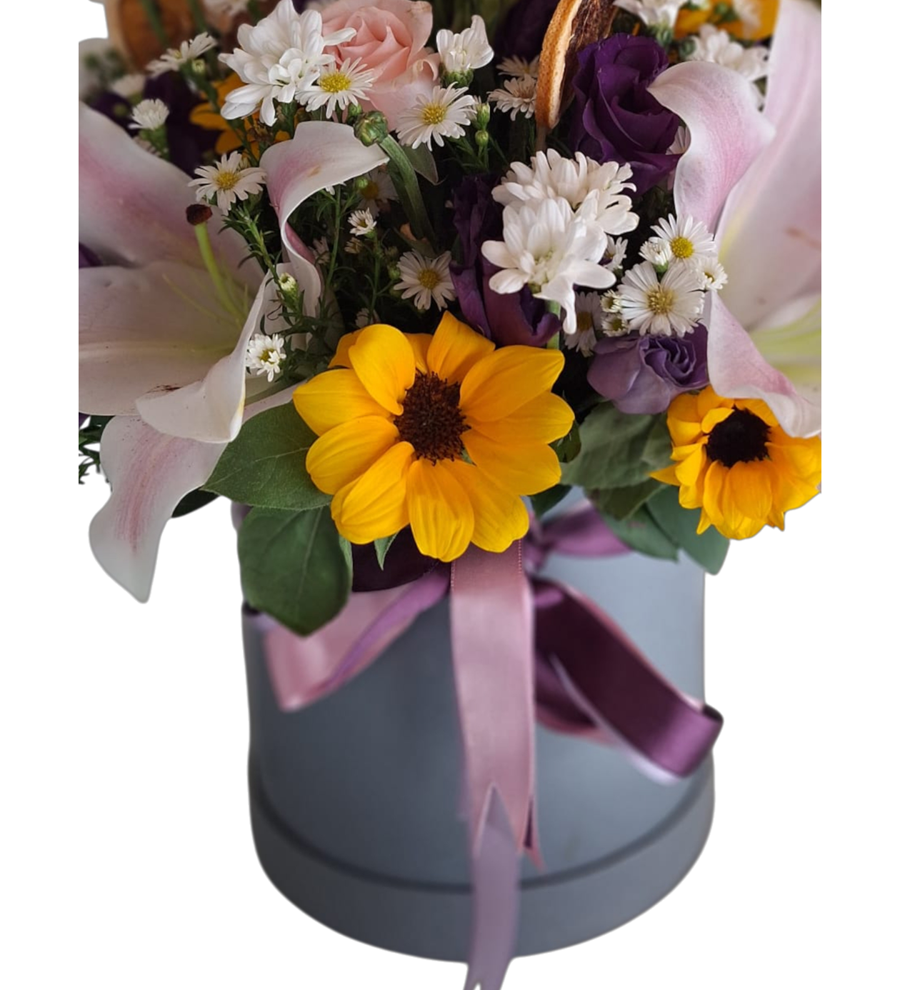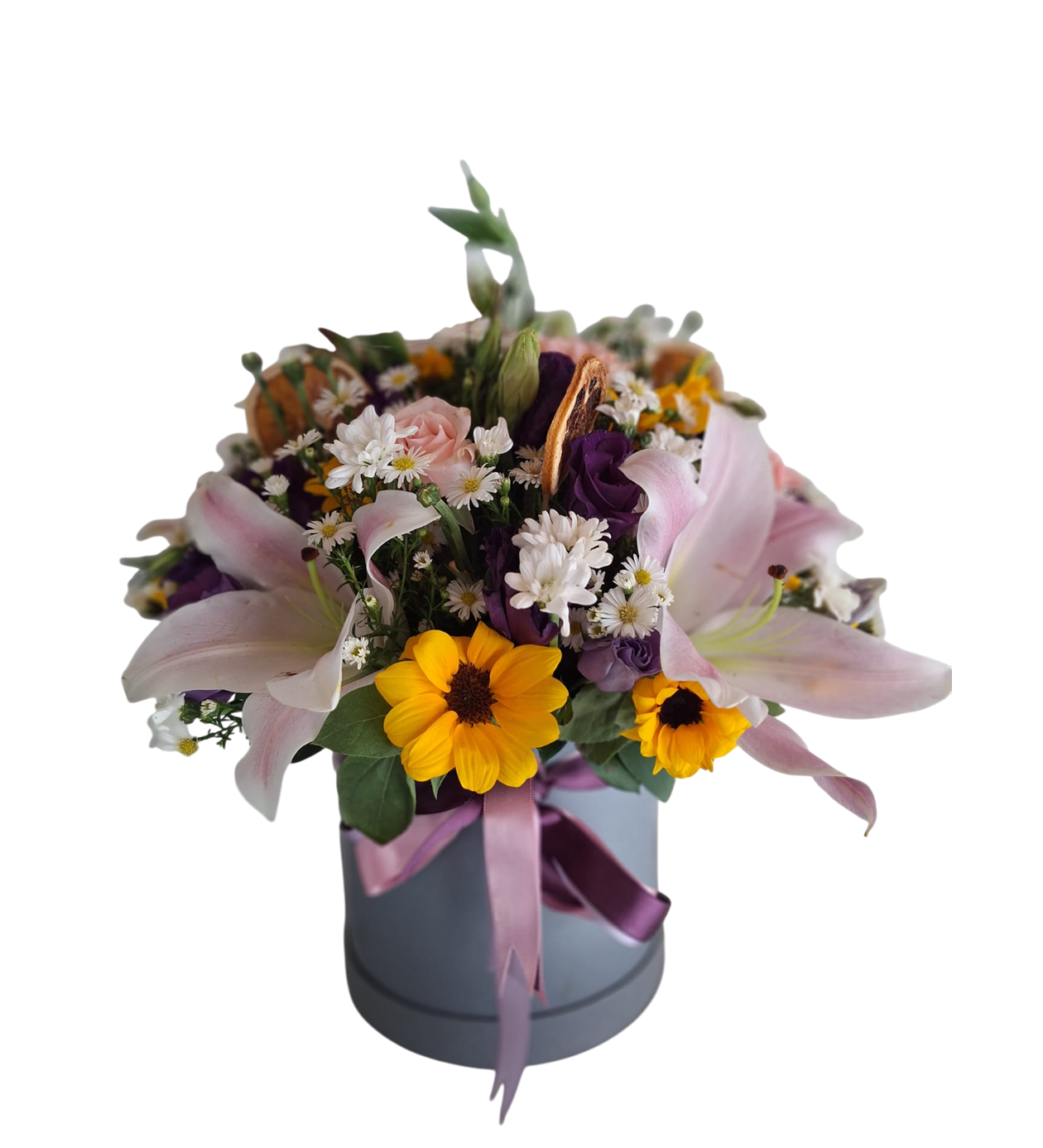 Kutu: Aranjman, gri veya koyu pastel tonda silindir şeklinde bir çiçek kutusu (box) içinde sunulmuştur. Kutu, modern çiçekçilikte popüler bir sunum şeklidir.