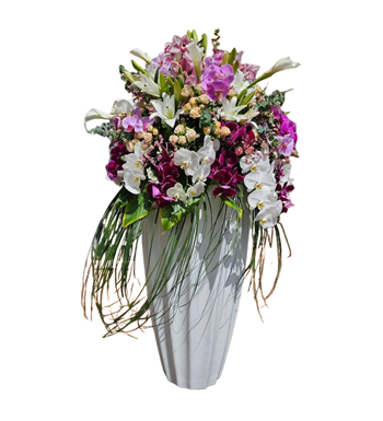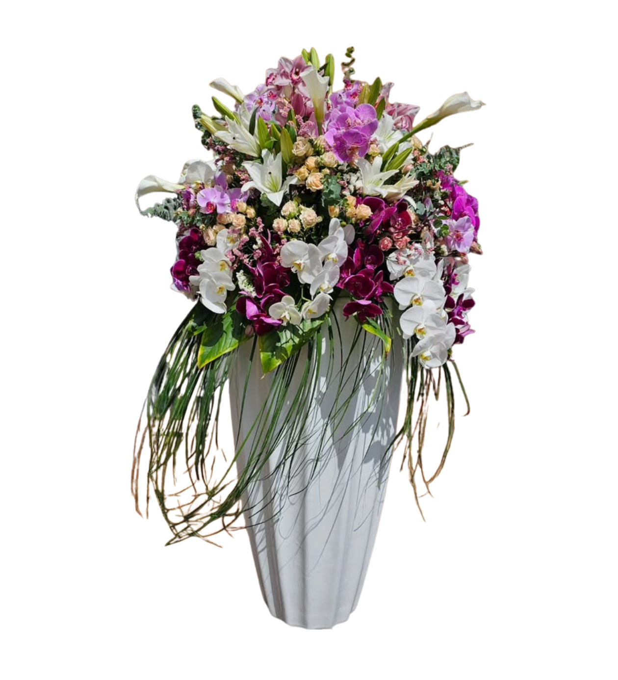 Dinamik Akış: Vazodan aşağıya sarkan uzun yeşillikler ile yukarıya doğru yükselen orkide ve kalaların yarattığı akışkan hareket.