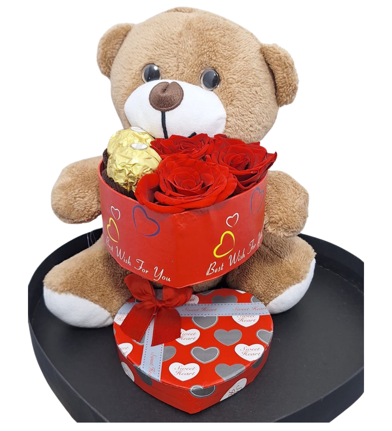 Kalp desenli alt sunum kutusu ve dekoratif kurdele detayları.