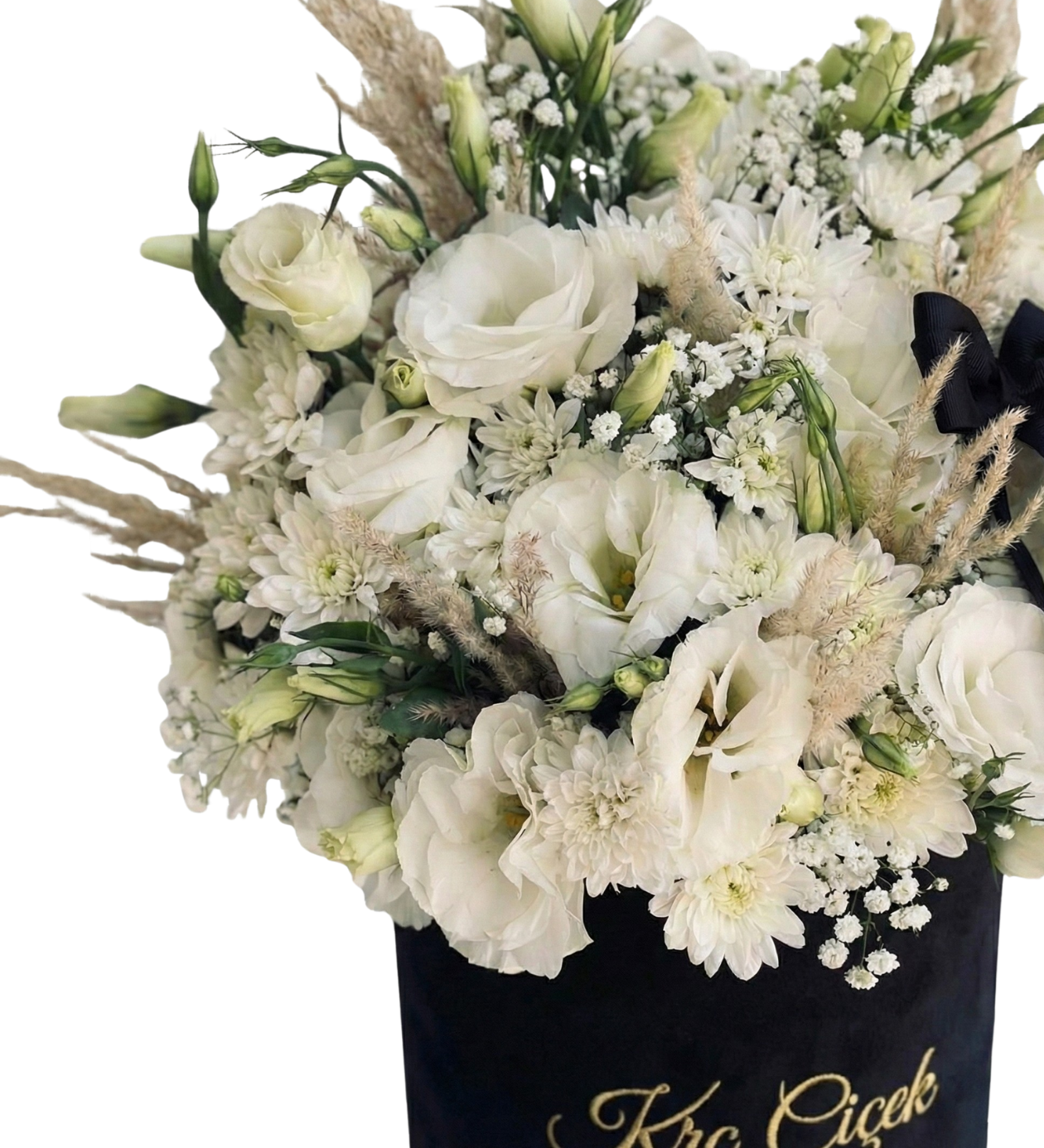 Ana Çiçekler: Aranjmanda yaklaşık 7-9 adet beyaz Lisyantus (veya mevsime göre beyaz gül) kullanılmıştır.
