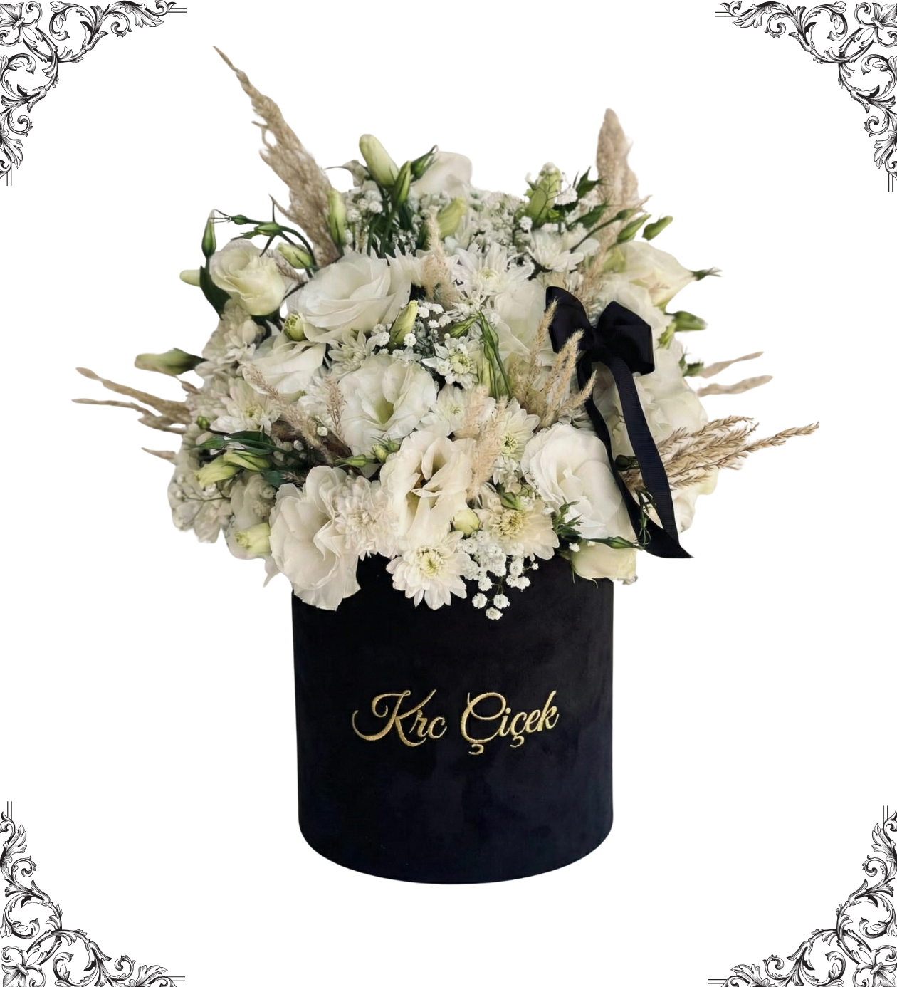 Kutu: Birinci sınıf kalite, "Krc Çiçek" gold baskılı Siyah Kadife Silindir Kutu (Midi/Maxi boy).