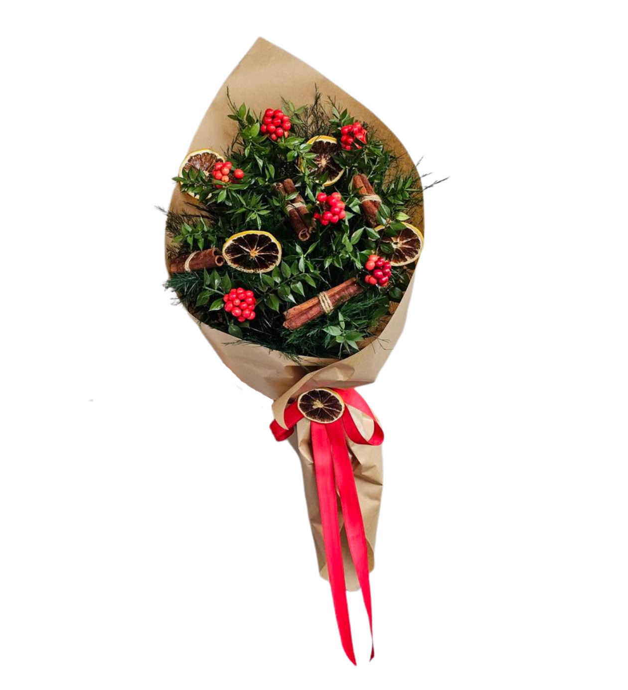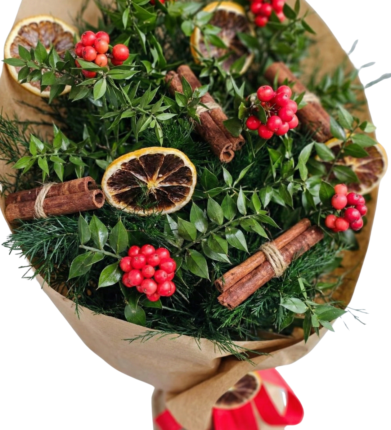 Tasarım Materyali: Doğal görünümlü ithal yeşil yapraklar ve kırmızı top meyveler (kokina/ilex tarzı).