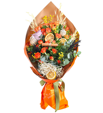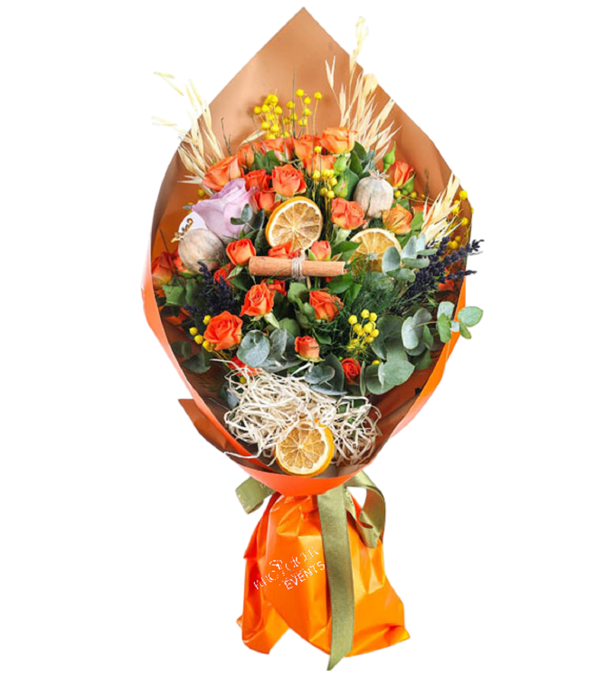 Turuncunun enerjisini, doğal dokuların huzur veren etkisiyle bir araya getiren bu özel buket; turuncu güller, okalyptus yaprakları, kuru portakal dilimleri, tarçın çubuğu ve doğal başaklar ile hazırlanmıştır. Estetik kraft ambalajı ve şık kurdelesiyle ilk bakışta fark yaratır.