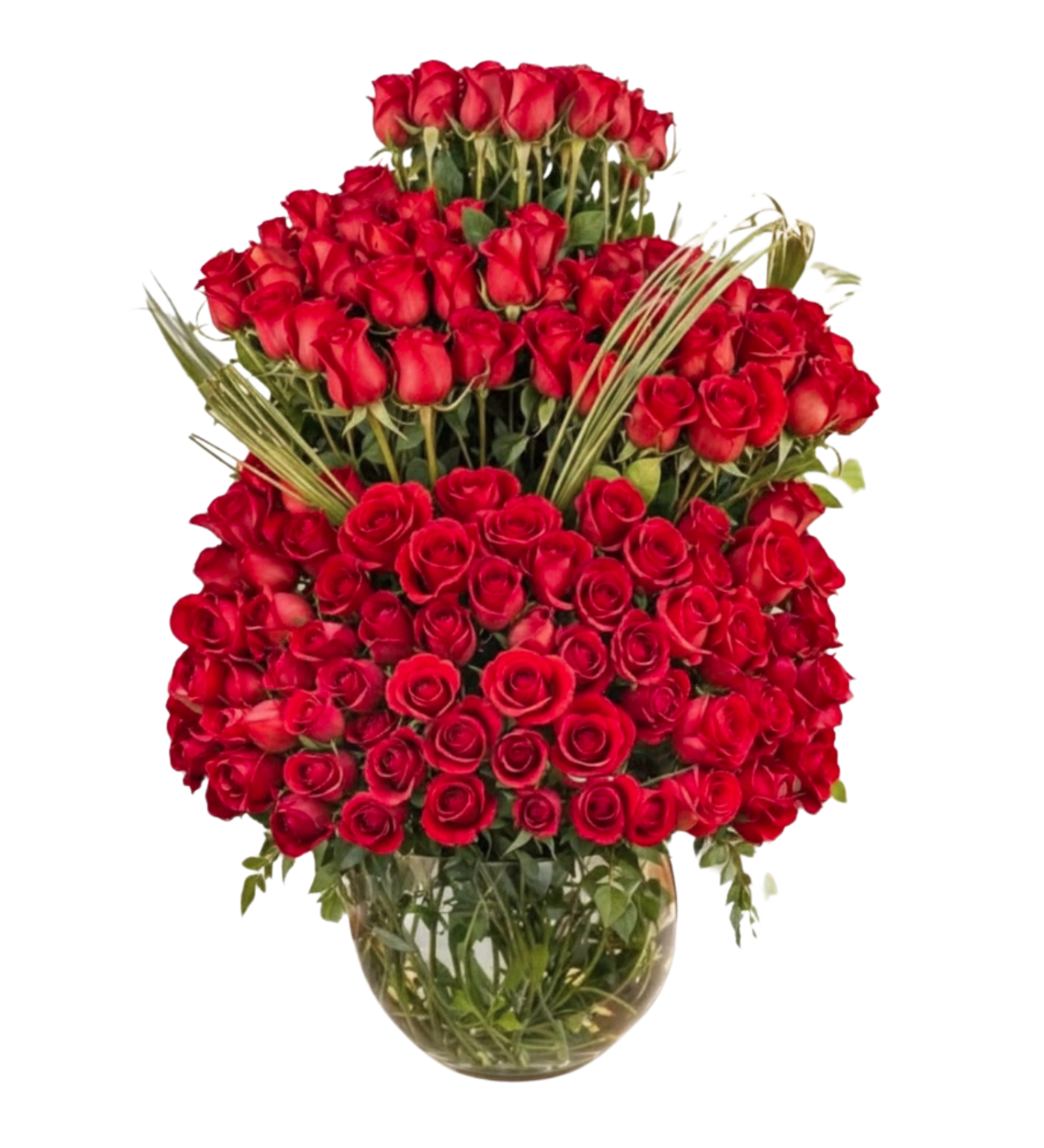 Bu özel tasarım kırmızı gül aranjmanı, görkemi ve zarafetiyle dikkat çeken premium bir çiçek çalışmasıdır. Katmanlı formu sayesinde hacimli ve etkileyici bir duruş sergilerken, her açıdan dolu ve estetik bir görünüm sunar.