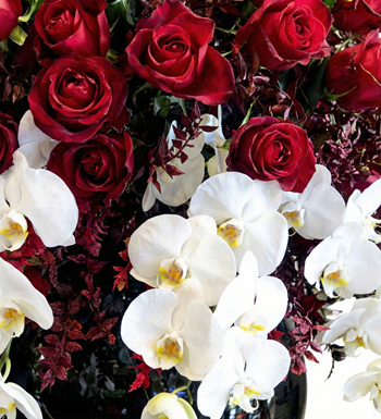 Yeşillikler: Güllerin kırmızısını ön plana çıkaran, bordo ve koyu yeşil tonlarında egzotik garnitürler.