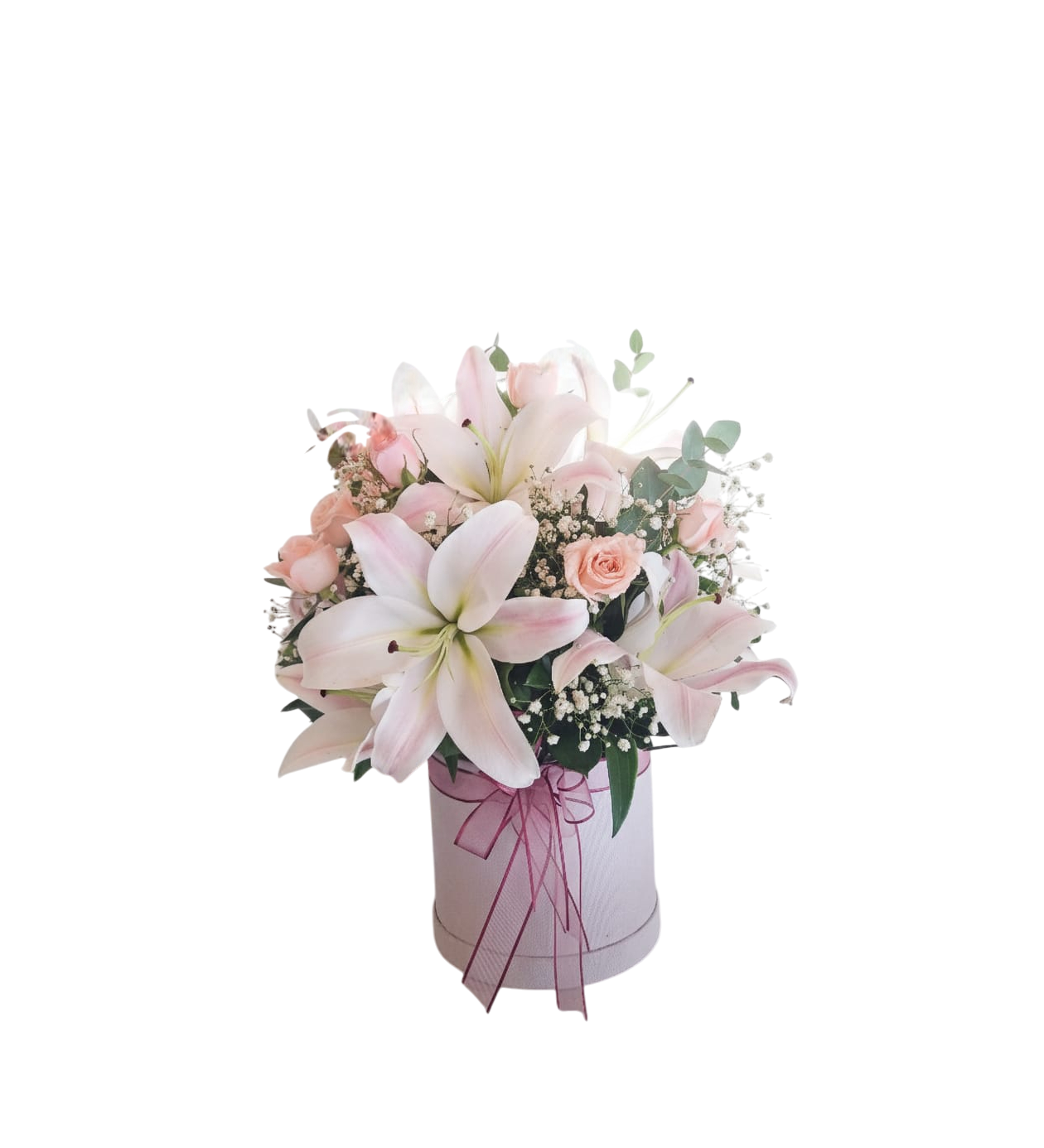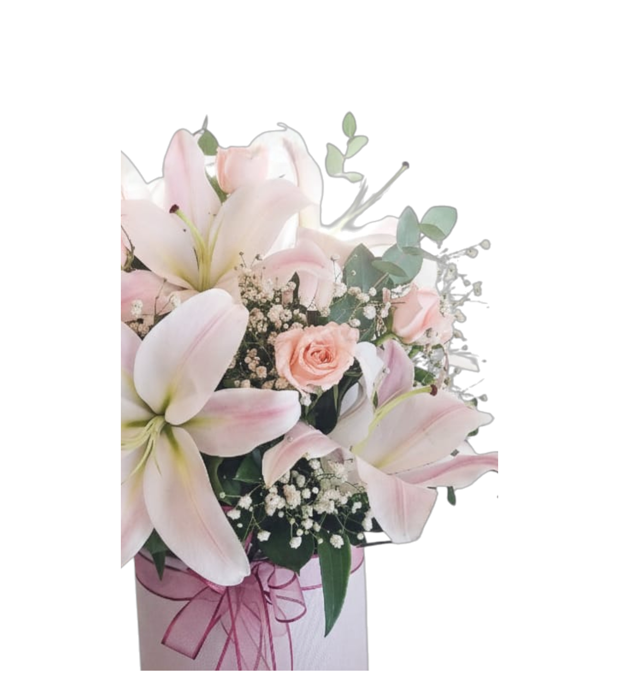Kutu: Aranjman, çiçeklerin tonuyla uyumlu, çok açık pembe veya krem renginde silindir şeklinde bir çiçek kutusu (box) içinde sunulmuştur.