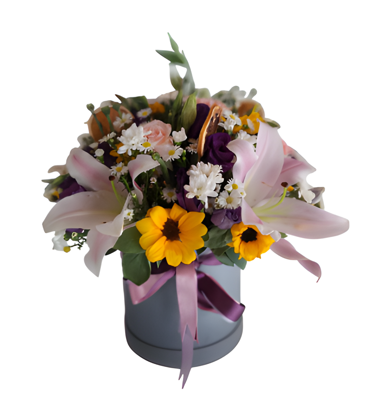 Kutu: Aranjman, gri veya koyu pastel tonda silindir şeklinde bir çiçek kutusu (box) içinde sunulmuştur. Kutu, modern çiçekçilikte popüler bir sunum şeklidir.